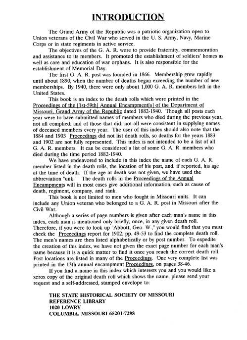 This extraction of the Grand Army of the Republic – Missouri Division – index to death rolls 1882-1940 printed in the Proceedings of the Annual Encampments of the Department of Missouri, Grand Army of the Republic dated from 1882-1940 was created using Google AI Studio from the images provided by the State Historical Society of Missouri
